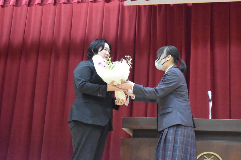 4月3日(金)に離任式を行いました。本校で熱心に指導していただいた先生が壇上で生徒に最後の言葉を伝えました。次の学校でのご活躍を祈念いたします。