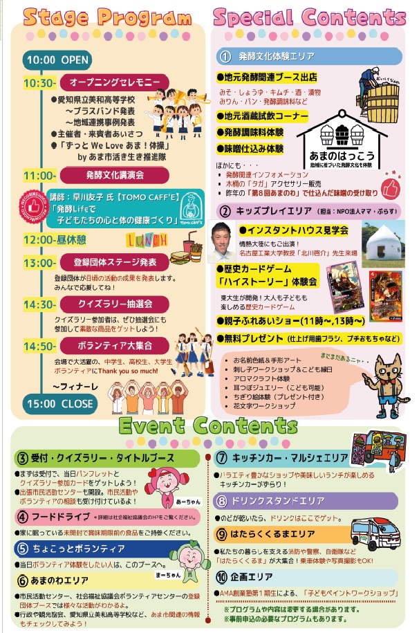 お知らせ/地域活動/学校生活 第9回 あまのわ に出展および発表を行います 2025年10月14日 10月18日(土)にあま市役所の駐車場で行われる「あまのわ」に出展および発表を行います。10:30分から本校ブラスバンド部の発表や学校の紹介、地域活動部による出展などボランティアとして参加します。マルシェやキッチンカーが多数参加する大きなイベントとなります。ご都合がつきましたら、ぜひ、ご来場ください。 PDFファイルダウンロード